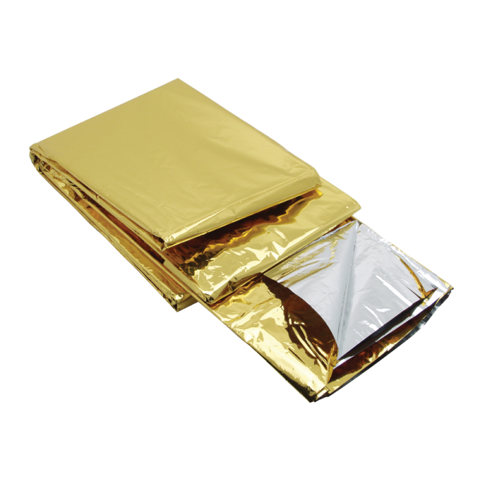 Dwustronny koc termiczny NRC o wymiarach: 200 x 120 cm, wykonany z aluminium.