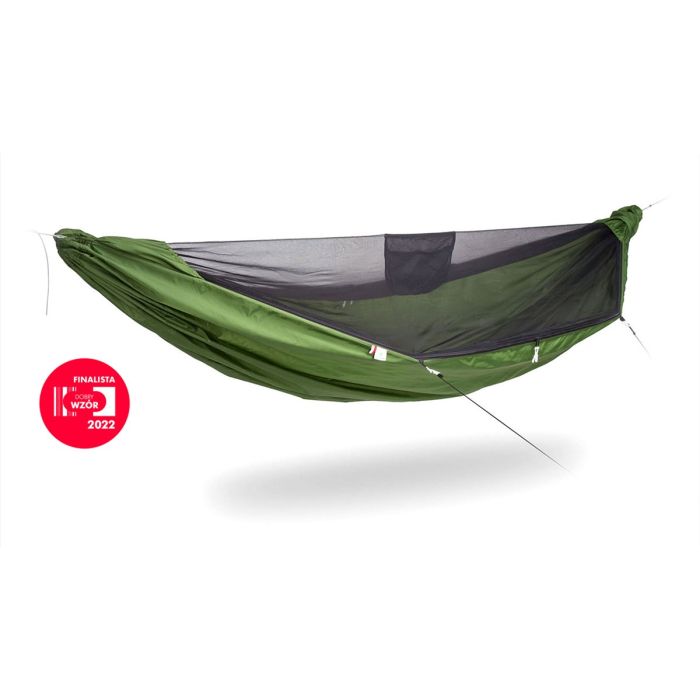 Materiał: nylon ripstop, gęsta siatka poliestrowa (moskitiera), polierter (taśmy), aluminium (karabinki), Dyneema polietylen (linki zawieszenia)